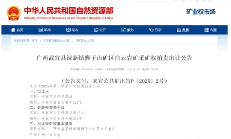 近日,來賓市自然資源局發(fā)布2025年第二期采礦權(quán)拍賣出讓公告,掛牌出讓廣西武宣縣祿新鎮(zhèn)獅子山礦區(qū)白云巖礦,礦區(qū)范圍內(nèi)累計查明資源儲量(石灰?guī)r+白云巖)11233.3萬噸(1.12億噸),擬出讓年限30年,起始價22343.71萬元(約2.23億元)。 廣西武宣縣祿新鎮(zhèn)獅子山礦區(qū)白云巖礦采礦權(quán)拍賣出讓公告 (公告文號:來賓公共礦出告P〔2025〕2號) 一、出讓人 名稱:來賓市自然資源局 場所:來賓市盤古大道中121號 二、礦業(yè)權(quán)交易平臺 名稱:來賓市公共資源交易中心 場所:來賓市紅水河大道331號 三、出讓采礦權(quán)基本情況 項目名稱:廣西武宣縣祿新鎮(zhèn)獅子山礦區(qū)白云巖礦 開采礦種:白云巖 地理位置:礦區(qū)位于武宣縣城西南220°方向的獅子山一帶,與武宣縣城直線距離約15km,屬武宣縣祿新鎮(zhèn)管轄。 面積:0.882平方千米 資源儲量:截至2023年12月10日,礦區(qū)范圍內(nèi)累計查明資源儲量(石灰?guī)r+白云巖)11233.3萬噸,其中探明(動用)資源量為39.2萬噸,邊坡壓占資源量(石灰?guī)r礦+白云巖礦)66.2萬噸,累計提交保有可利用資源量(石灰?guī)r+白云巖礦)11127.9萬噸。其中,礦區(qū)范圍內(nèi)累計查明保有資源儲量(石灰?guī)r礦)307.1萬噸,其中邊坡壓占資源量(石灰?guī)r礦)0.005萬噸,累計提交保有可利用資源量(石灰?guī)r礦)307.1萬噸;礦區(qū)范圍內(nèi)累計查明保有資源儲量(白云巖礦)10887.0萬噸,其中邊坡壓占資源量(白云巖礦)66.2萬噸,累計提交保有可利用資源量(白云巖礦)10820.8萬噸。扣除邊坡壓占資源量后,礦山設(shè)計可利用白云巖礦、石灰?guī)r礦礦石量11127.9萬噸(合約3992.3萬立方米),根據(jù)370萬噸/年的礦山生產(chǎn)規(guī)模(礦石量),礦山開采回采率按95%計算,損失率為5%,則礦山實際可采的白云巖礦、石灰?guī)r礦資源量為11127.9×95%=10571.5萬噸(含原采礦權(quán)剩余已出讓未采出白云巖礦資源量為64.82萬噸)。 開采標(biāo)高: +344.30米至 +130.0米 資源開發(fā)利用情況:新立礦權(quán) 礦山地質(zhì)環(huán)境保護(hù)及土地復(fù)墾要求:競得人取得采礦許可證之后必須按評審?fù)ㄟ^的《礦產(chǎn)資源開發(fā)利用與保護(hù)總體方案》及《廣西壯族自治區(qū)自然資源廳 廣西壯族自治區(qū)發(fā)展和改革委員會 廣西壯族自治區(qū)生態(tài)環(huán)境廳關(guān)于印發(fā)碳酸鈣礦山開采及修復(fù)要求的通知》(桂自然資發(fā)〔2021〕79號)的要求進(jìn)行礦山開發(fā)利用及修復(fù),合理綜合利用礦產(chǎn)資源;按照《礦產(chǎn)資源開發(fā)利用與保護(hù)總體方案》要求或當(dāng)?shù)乜h(區(qū))人民政府的要求進(jìn)行排廢;按照綠色礦山創(chuàng)建的要求進(jìn)行綠色礦山建設(shè),遵守國家有關(guān)勞動安全、礦山地質(zhì)環(huán)境保護(hù)與土地復(fù)墾等相關(guān)法律法規(guī),依法繳納國家規(guī)定的有關(guān)稅費(fèi),并按《礦產(chǎn)資源開發(fā)利用與保護(hù)總體方案》進(jìn)行礦山修復(fù)和礦山土地復(fù)墾,以及開設(shè)礦山地質(zhì)環(huán)境治理恢復(fù)賬戶并按規(guī)定計提礦山地質(zhì)環(huán)境治理恢復(fù)基金、預(yù)存土地復(fù)墾費(fèi)。競得人還應(yīng)承擔(dān)原采礦權(quán)的生態(tài)修復(fù)義務(wù)。 擬出讓年限:30年 起始價:22343.71萬元 四、投標(biāo)人/競買人的資質(zhì)條件 1.在中華人民共和國境內(nèi)依法登記注冊具有獨立法人資格的公司、企業(yè),除法律另有規(guī)定外,均可參加競買;本次競買不接受聯(lián)合競買。 2.競買申請人須具有良好企業(yè)信譽(yù);有競得履約能力和信用;無不良信用記錄;在“信用中國”或“國家企業(yè)信用信息公示系統(tǒng)”無列入經(jīng)營異常、失信名單、行賄人及受賄人等不良行為記錄(包括法定代表人及其股東等)。 3.凡是在我市有過不履行采礦權(quán)人義務(wù)或者不履行《采礦權(quán)出讓合同》的采礦權(quán)人或競得人,不得參加本次采礦權(quán)拍賣的競買活動。 五、出讓方式及交易的時間、地點 出讓方式:拍賣 拍賣時間:2025年05月13日 地點:http://ggzy.jgswj.gxzf.gov.cn/lbggzy/ 六、獲取拍賣文件的途徑和申請報名的起止時間及方式 獲取拍賣文件的途徑:廣西壯族自治區(qū)公共資源交易平臺系統(tǒng)(廣西?來賓)(http://ggzy.jgswj.gxzf.gov.cn/lbggzy/) 申請報名的起止時間:2025年04月11日—2025年05月12日 申請報名方式: (一)意向競買人登錄廣西壯族自治區(qū)公共資源交易平臺系統(tǒng)(廣西來賓)(http://ggzy.jgswj.gxzf.gov.cn/lbggzy/)進(jìn)行用戶注冊。 (二)意向競買人通過登錄廣西壯族自治區(qū)公共資源交易平臺系統(tǒng)數(shù)字證書(CA)交叉互認(rèn)平臺(http://ggzy.jgswj.gxzf.gov.cn/gxggzy/CAhrpt/CAlogin.html)了解數(shù)字證書(CA)辦理流程,辦理CA數(shù)字證書。 (三)意向競買人持CA數(shù)字證書登錄交易平臺系統(tǒng)完善業(yè)務(wù)類型注冊。 (四)意向競買人持CA數(shù)字證書登錄交易平臺系統(tǒng)進(jìn)行報名?。 申請報名需提供的資料: (一)競買申請書(加蓋公章的彩色掃描件,格式見附件1)。 (二)銀行保函或者保證金(彩色掃描件)。直接繳納保證金的應(yīng)通過廣西壯族自治區(qū)公共資源交易系統(tǒng)(來賓)“權(quán)益類保證金”模塊線上辦理。 (三)企業(yè)營業(yè)執(zhí)照正本和副本(未辦理五證合一的須提交