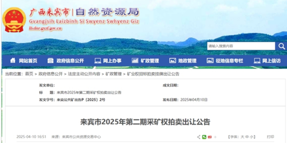 4月10日,廣西來賓市自然資源局發(fā)布2025年第二期采礦權拍賣出讓公告。本次出讓的采礦權為武宣縣祿新鎮(zhèn)獅子山礦區(qū)白云巖礦,屬凈采礦權出讓,累計查明資源儲量(石灰?guī)r+白云巖)約1.12億噸,可采儲量約1.05億噸,生產規(guī)模370萬噸/年,出讓年限30年,起始價超2.23億元,其他費用約2268.53萬元,資源成本超2.19元/噸。 本次采礦權拍賣出讓涉及的采礦權出讓收益繳納方式為分期繳納,共分16期,首期征收比例為成交采礦權出讓收益的15%;剩余部分在采礦許可證有效期內按約定分期繳清,均攤征收年限為15年,每年度一期,每期具體繳款時間及金額在采礦權出讓合同中確定。競得人也可一次性繳清采礦權出讓收益。 該采礦權位于武宣縣城西南220°方向的獅子山一帶,與武宣縣城直線距離約15千米,屬武宣縣祿新鎮(zhèn)管轄。礦區(qū)北面有武平高速、S323省道、東有G209國道可達武宣縣城。礦區(qū)東面有簡易公路與村、鄉(xiāng)鎮(zhèn)道路相通,西面有礦山公路與鄉(xiāng)鎮(zhèn)道路相連,武宣縣建有龍從新碼頭,黔江可通航上至柳州,下至桂平、梧州、廣州。武宣縣跟貴港市都建有可通航水運的碼頭,礦區(qū)公路到武宣縣龍從新碼頭約21千米,到貴港市大東碼頭約60千米,交通便利。 擬出讓礦區(qū)范圍及影響范圍合計1323.15畝土地及地面附著物的權屬已初步認定,土(林)地征(租)用、地面附著物等補償費已由武宣縣征地辦進行核算,涉及所需土地征用、墳墓搬遷費用總共約1640.73萬元。 此外,該采礦權為原礦山擴大礦區(qū)范圍重新出讓的情形,原有礦山資產為原采礦權剩余已出讓未采出白云巖資源量為64.82萬噸,經委托資質單位評估,原采礦權價值平均估值為246.9萬元。競得人在15日內按資產評估值一次性全額支付補償款到武宣縣人民政府指定賬戶。 同時,該礦山已完成的出讓前期工作包括礦產資源開發(fā)利用與保護總體方案、水土保持方案、環(huán)境影響報告、林地使用可行性報告及安全設計三同時報告編制、采礦權出讓收益和資產評估,費用總計380.9萬元。 其中,礦產資源開發(fā)利用與保護總體方案編制費用為273萬元,水土保持方案、環(huán)境影響報告、林地使用可行性報告及安全設計三同時報告編制費用為99.2萬元,采礦權出讓收益評估經費為7.2萬元,原采礦權人資產評估經費為1.5萬元。