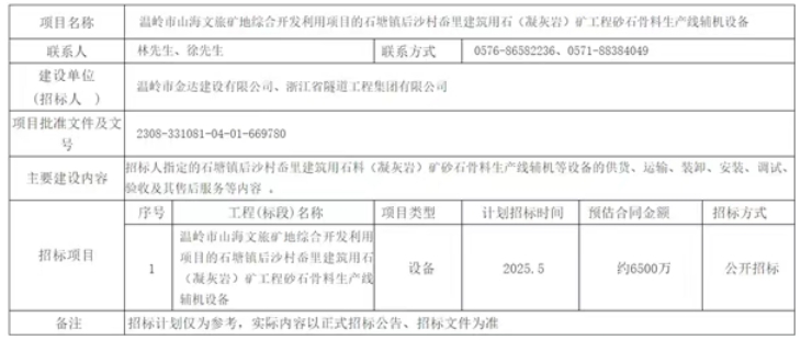 4月10日,浙江省臺(tái)州市溫嶺市人民政府發(fā)布溫嶺市山海文旅礦地綜合開(kāi)發(fā)利用項(xiàng)目的石塘鎮(zhèn)后沙村岙里建筑用石(凝灰?guī)r)礦工程砂石骨料生產(chǎn)線輔機(jī)設(shè)備招標(biāo)計(jì)劃,計(jì)劃2025年5月招標(biāo)。預(yù)估合同金額約6500萬(wàn)。 據(jù)了解,該項(xiàng)目位于溫嶺市石塘鎮(zhèn)后沙村岙里,估算投資近45億元,砂石儲(chǔ)量近1.2億噸,生產(chǎn)規(guī)模600萬(wàn)噸/年,擬開(kāi)采年限20年。產(chǎn)品種類(lèi)包括但不限于山皮土、宕渣、普通碎石、普通機(jī)制砂、整形精品碎石、精品機(jī)制砂。 本次招標(biāo)內(nèi)容包括招標(biāo)人指定的砂石骨料生產(chǎn)線輔機(jī)等設(shè)備的供貨、運(yùn)輸、裝卸、安裝、調(diào)試、驗(yàn)收及其售后服務(wù)等內(nèi)容。