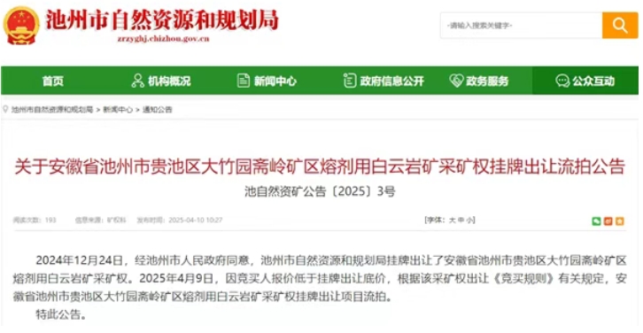 因競買人報(bào)價(jià)低于掛牌出讓底價(jià),根據(jù)該采礦權(quán)出讓《競買規(guī)則》有關(guān)規(guī)定,安徽省池州市貴池區(qū)大竹園齋嶺礦區(qū)熔劑用白云巖礦采礦權(quán)掛牌出讓項(xiàng)目已于4月9日流拍。 據(jù)了解,該礦位于池州市城東南方向110°約24公里處,資源總量超2億噸,擬設(shè)生產(chǎn)規(guī)模600萬噸/年,擬出讓年限25.2年,起始價(jià)為6.3億元。2024年12月23日,該礦第一次掛牌;2025年2月10日,該采礦權(quán)中止掛牌;2025年4月2日,該礦恢復(fù)掛牌。 根據(jù)相關(guān)公告,該礦開采礦種為熔劑用白云巖礦、建筑石料用灰?guī)r礦、建筑用白云巖礦。礦區(qū)范圍內(nèi)熔劑用白云巖礦資源量約1.33億噸,建筑石料用灰?guī)r礦資源量2847.97萬噸,建筑用白云巖礦資源量1315.39萬噸,鈣質(zhì)頁巖2623.28萬噸(可綜合利用)。 按照法律法規(guī)和相關(guān)文件要求,在采礦權(quán)出讓后,礦區(qū)采礦權(quán)內(nèi)及影響區(qū)范圍所涉及的用地、用林、用電、水土保持、環(huán)保、運(yùn)輸?shù)认嚓P(guān)事宜,由競得人按照自然資源、應(yīng)急管理、水利、生態(tài)環(huán)境、交通運(yùn)輸、林業(yè)等相關(guān)部門的有關(guān)程序辦理審批手續(xù)。
