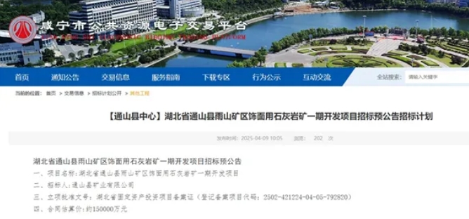 近日,湖北咸寧公共資源電子交易平臺(tái)發(fā)布湖北省通山縣雨山礦區(qū)飾面用石灰?guī)r礦一期開發(fā)項(xiàng)目招標(biāo)預(yù)公告,招標(biāo)人通山縣礦業(yè)有限公司,建設(shè)地點(diǎn)通山縣燕廈鄉(xiāng),計(jì)劃工期1095日歷天。 據(jù)公告顯示,該項(xiàng)目合同估算價(jià)約15億元,主要建設(shè)內(nèi)容包括礦石開采系統(tǒng)、礦石運(yùn)輸系統(tǒng)、尾礦綜合利用系統(tǒng)、礦石加工生產(chǎn)相關(guān)的公輔設(shè)施,包括供配電系統(tǒng)、給排水系統(tǒng)等、辦公及生活福利設(shè)施,含食堂浴室、綜合樓和職工宿舍等。 2024年12月底,通山縣礦業(yè)有限公司底價(jià)6.65億元競(jìng)得該項(xiàng)目礦權(quán)。該項(xiàng)目資源總量約1.9億噸,年開采飾面用石灰?guī)r50萬(wàn)方、建筑石料用石灰?guī)r約490萬(wàn)噸,出讓年限29年。 據(jù)悉,通山縣礦業(yè)有限公司成立于2024年2月23日,所屬行業(yè)為開采專業(yè)及輔助性活動(dòng),經(jīng)營(yíng)范圍包含非煤礦山礦產(chǎn)資源開采、金屬與非金屬礦產(chǎn)資源地質(zhì)勘探、建設(shè)工程監(jiān)理、非金屬礦及制品銷售、礦山機(jī)械銷售、礦業(yè)權(quán)評(píng)估服務(wù)、采礦行業(yè)高效節(jié)能技術(shù)研發(fā)等,是通山縣國(guó)有資本投資運(yùn)營(yíng)有限公司全資子公司,屬國(guó)有企業(yè)。