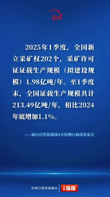 會(huì)上,自然資源部宣傳教育中心主任夏俊指出,2025年1季度,全國新立采權(quán)202個(gè),采礦許可證證載生產(chǎn)規(guī)模(擬建設(shè)規(guī)模)1.98億噸/年。至1季度末,全國證載生產(chǎn)規(guī)模共計(jì)213.49億噸/年,相比2024年底增加1.1%。