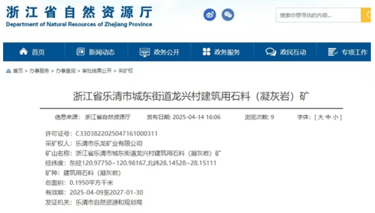 據(jù)浙江省自然資源廳消息,日前,浙江省樂清市城東街道龍興村建筑用石料(凝灰?guī)r)礦取得采礦許可證。 該礦出讓資源總量1208.42萬噸,設(shè)計規(guī)模310萬噸/年,出讓年限5年,起始價1.38億元,成交價2.18億元,政策處理費用約1334.53萬元,加之道路建設(shè)費用及土地復(fù)墾基金共約4611.88萬元,該礦資源成本約22.96元/噸。 2025年1月22日,樂清市樂龍礦業(yè)有限公司競得該項目礦權(quán)。 據(jù)悉,樂清市樂龍礦業(yè)有限公司成立于2017年6月12日,所屬行業(yè)為其他采礦業(yè),經(jīng)營范圍包含建筑用石料(凝灰?guī)r)露天開采、石材加工/銷售、填方/填土工程服務(wù)等。