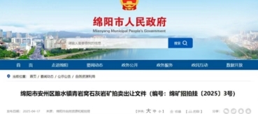 近日,四川省綿陽(yáng)市人民政府發(fā)布綿陽(yáng)市安州區(qū)雎水鎮(zhèn)青巖窩石灰?guī)r礦拍賣出讓公告,拍賣時(shí)間為2025年5月20日。