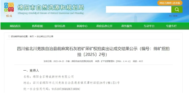 據(jù)四川綿陽市自然資源和規(guī)劃局消息,四川省北川羌族自治縣前麻窩石灰?guī)r礦采礦權(quán)成功出讓。該礦資源儲量超1.1億噸,生產(chǎn)規(guī)模不低于500萬噸/年,出讓年限21年,綿陽金石精誠新材料有限公司超2.97億元底價競得。經(jīng)計算,該項目競得成本約2.7元/噸。 據(jù)悉,該項目存在原采礦權(quán)人,但現(xiàn)有公開信息未明確提及原采礦權(quán)人的具體名稱,暫未可知該項目原采礦權(quán)人是否為競得人綿陽金石精誠新材料有限公司,假如不是,那么競得人還須支付原采礦權(quán)人資產(chǎn)費用及剩余資源量價值超1億元。加之該費用,該項目競得成本則約3.62元/噸。 據(jù)統(tǒng)計,截止目前,四川已成功出讓18宗砂石類采礦權(quán)(包含此次砂石礦),合計資源儲量7.6億噸,設(shè)計生產(chǎn)規(guī)模約3900萬噸/年,出讓價值16.31億元,平均成本2.44元/噸。 除此之外,四川還有一宗資源儲量超1億噸,生產(chǎn)規(guī)模350萬噸/年石灰?guī)r礦正在掛牌出讓中,拍賣時間為2025年5月20日。 500萬噸/年砂石采礦權(quán)成功出讓 四川省北川羌族自治縣前麻窩石灰?guī)r礦開采礦種石灰?guī)r、建筑石料用灰?guī)r、建筑用白云巖,開采境界內(nèi)有石灰?guī)r資源量3683.94萬噸,建筑石料用灰?guī)r資源量2253.10萬噸,建筑用白云巖資源量5070.26萬噸,合計資源量1.1億噸,生產(chǎn)規(guī)模不低于500萬噸/年,出讓年限21年,綿陽金石精誠新材料有限公司超2.97億元底價競得。 競得人還須支付原采礦權(quán)人建構(gòu)筑物、機器設(shè)備等所涉及的實物資產(chǎn)和無形資產(chǎn)7589.29萬元以及原采礦權(quán)剩余資源量859.89萬噸,按第三方評估機構(gòu)對采礦權(quán)出讓收益評估價值2.93元/噸*剩余資源量礦石計算價值約2519.48萬元,由競得人直接向原礦權(quán)人承擔(dān)支付,相關(guān)風(fēng)險自行承擔(dān)。 據(jù)悉,綿陽金石精誠新材料有限公司成立于2024年5月6日,所屬行業(yè)為科技推廣和應(yīng)用服務(wù)業(yè),經(jīng)營范圍包含新材料技術(shù)推廣服務(wù)、技術(shù)服務(wù)、非金屬礦及制品銷售、非金屬礦物制品制造、建筑用石加工、建筑材料銷售等等。