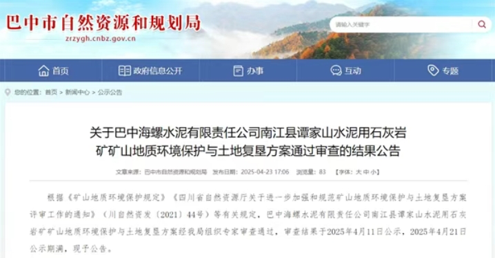 近日,四川巴中市自然資源和規(guī)劃局發(fā)布巴中海螺水泥有限責(zé)任公司南江縣譚家山水泥用石灰?guī)r礦礦山地質(zhì)環(huán)境保護(hù)與土地復(fù)墾方案通過審查的結(jié)果公告,已通過審批。
