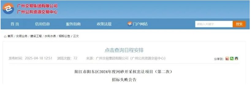近年來(lái),隨著砂石行業(yè)進(jìn)入深度調(diào)整時(shí)期,即使是曾經(jīng)最為火爆的廣東砂石市場(chǎng)也出現(xiàn)低迷現(xiàn)象,就在2025年的前4個(gè)月中就有4宗礦權(quán)出現(xiàn)流拍、招標(biāo)失敗、中止出讓?zhuān)偝鲎屍鹗純r(jià)超13億元。 當(dāng)前,房地產(chǎn)和基建投資增速下降,砂石行業(yè)有效需求不足,行業(yè)面臨產(chǎn)能過(guò)剩,砂石礦山企業(yè)應(yīng)更加注重生產(chǎn)線建設(shè)的合理性與成本、石礦運(yùn)營(yíng)費(fèi)用的高低、銷(xiāo)售區(qū)域產(chǎn)能和市場(chǎng)需求量的大小、運(yùn)輸條件的好壞和運(yùn)輸費(fèi)用的高低、礦山投資的資金成本、對(duì)石礦運(yùn)營(yíng)的熟悉程度等因素,積極應(yīng)對(duì)行業(yè)挑戰(zhàn)! 2025年2月 2025年2月,汕尾市管轄海域CB22-05區(qū)塊海砂開(kāi)采海域使用權(quán)和采礦權(quán)流拍,據(jù)了解,此次為這宗海砂項(xiàng)目的第六次掛牌。首次終止、二次流拍,三次終止,四次流拍,五次終止,起始價(jià)“一降再降”。第六次出讓最終還是未能成功出讓。 據(jù)了解,CB22-05海砂開(kāi)采海域使用權(quán)和采礦權(quán)位于廣東省汕尾市陸豐市田尾角東南側(cè)管轄海域CB22-05區(qū)塊,海域面積2.12平方千米,海砂資源儲(chǔ)量2581.92萬(wàn)立方米,可采資源量2097.26萬(wàn)立方米。 本次海域使用權(quán)和采礦權(quán)出讓年限為3年,起始價(jià)為人民幣62917.8萬(wàn)元(其中:海域使用權(quán)起始價(jià)25305.54 萬(wàn)元,海砂采礦權(quán)起始價(jià)37612.26 萬(wàn)元)。 2025年3月 2025年3月,廣東省連平縣陂頭鎮(zhèn)楊貢坑礦區(qū)建筑用花崗巖、建筑用輝綠巖礦采礦權(quán)未能成功出讓發(fā)布流拍公告。該礦于2025年1月13日掛牌出讓?zhuān)瑨炫破鹗純r(jià)為人民幣5713.17萬(wàn)元,資源儲(chǔ)量約740萬(wàn)方,設(shè)計(jì)開(kāi)采規(guī)模為60萬(wàn)立方米/年,出讓年限為15年。 該礦位于連平縣城區(qū)311°方向,直距約27.50km處,行政區(qū)劃隸屬連平縣陂頭鎮(zhèn)管轄。礦區(qū)范圍內(nèi)建筑用花崗巖保有控制的資源量619.22萬(wàn)立方米,推斷的資源量483.57萬(wàn)立方米;建筑用輝綠巖保有控制的資源量礦石量120.31萬(wàn)立方米,保有推斷的資源量礦石量32.51萬(wàn)立方米。 2025年4月 2025年4月,廣東陽(yáng)江市陽(yáng)東區(qū)2024年度河砂開(kāi)采權(quán)出讓項(xiàng)目(第二次)因沒(méi)有投標(biāo)單位辦理投標(biāo)登記,根據(jù)招標(biāo)文件及相關(guān)法律法規(guī)的規(guī)定,招標(biāo)失敗。 本次招標(biāo)包含三個(gè)可采區(qū),采區(qū)一控制開(kāi)采總量為24.1萬(wàn)方;采區(qū)二控制開(kāi)采總量為4.77萬(wàn)方;采區(qū)三控制開(kāi)采總量為1.73萬(wàn)方。總開(kāi)采量30.6萬(wàn)方。最高投標(biāo)限價(jià)2754萬(wàn)元。單價(jià)約90元/噸。 2025年4月1日,云浮市自然資源局發(fā)布廣東省云浮市云城區(qū)坳頭大窩坑區(qū)水泥用石灰?guī)r、溶劑用白云巖采礦權(quán)中止公告。 該礦確定的水泥用石灰?guī)r、熔劑用白云巖和水泥用配料類(lèi)礦石可采儲(chǔ)量為28484.79萬(wàn)噸,其中水泥用石灰?guī)r礦17411.32萬(wàn)噸,熔劑用白云巖礦8428.90萬(wàn)噸,水泥配料類(lèi)原料礦石量1461.09萬(wàn)立方米(2644.57萬(wàn)噸)。起始價(jià)65000萬(wàn)元,出讓年限30年。
