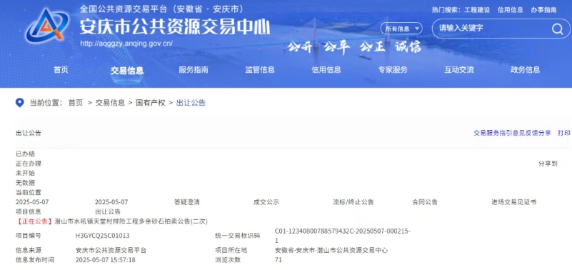 近日,安徽省安慶市潛山市公開出讓潛山市水吼鎮(zhèn)天堂村排險(xiǎn)工程多余砂石,根據(jù)出讓公告內(nèi)容,現(xiàn)有堆放砂石方量56398.41立方米(100163.58噸),起拍價(jià)160.26萬元,競(jìng)買保證金16萬元。