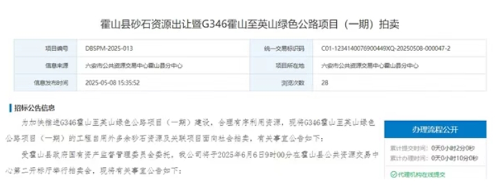 5月8日,安徽省六安市公共資源交易中心霍山縣分中心發(fā)布霍山縣砂石資源出讓暨G346霍山至英山綠色公路項(xiàng)目(一期)拍賣公告。標(biāo)的一為3963.01萬噸砂石資源,標(biāo)的二為G346霍山至英山綠色公路項(xiàng)目(一期)建設(shè)。以上兩個(gè)標(biāo)的整體拍賣,總參考價(jià)近25億元,拍賣時(shí)間為2025年6月6日。