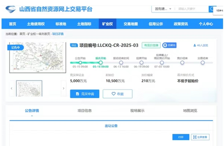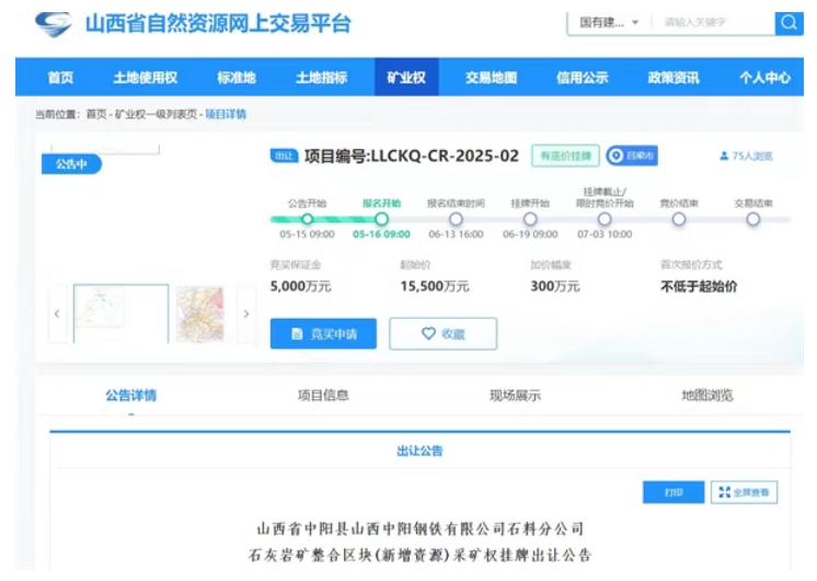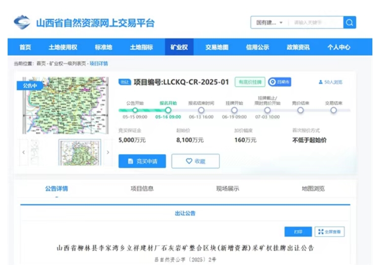 近日,山西省自然資源網(wǎng)上交易平臺(tái)發(fā)布3宗超億噸砂石大礦出讓公告。3宗砂石礦合計(jì)資源儲(chǔ)量超4.25億噸,均為新增資源儲(chǔ)量出讓,平均起拍成本約0.8元/噸,掛牌報(bào)價(jià)時(shí)間為2025年6月19日-7月3日。 其中,中陽縣山西中陽鋼鐵有限公司石料分公司石灰?guī)r礦整合區(qū)塊(新增資源)采礦權(quán)資源儲(chǔ)量最高,約2.05億噸,起拍成本最低,超0.75元/噸; 山西省交城縣富來石料廠石灰?guī)r礦整合區(qū)塊(新增資源)采礦權(quán)出讓年限最長(zhǎng),25.6年,起拍成本最高,約0.85元/噸。 1.23億噸!山西交城石灰?guī)r礦掛牌出讓 山西省呂梁市交城縣富來石料廠石灰?guī)r礦整合區(qū)塊(新增資源)礦區(qū)面積1.106平方公里,開采礦種建筑石料用灰?guī)r、石英砂巖。此次新出讓建筑石料用灰?guī)r資源量超1.14億噸、石英砂巖968萬噸,合計(jì)超1.23億噸,擬出讓年限25.6年,起始價(jià)1.05億元。經(jīng)計(jì)算,該項(xiàng)目起拍成本約0.85元/噸。 1.06億噸!山西柳林石灰?guī)r礦掛牌出讓 山西省呂梁市柳林縣李家灣鄉(xiāng)立祥建材廠石灰?guī)r礦整合區(qū)塊(新增資源)礦區(qū)面積0.6582平方公里,開采礦種建筑石料用灰?guī)r。此次新出讓建筑石料用灰?guī)r資源量超1.06億噸,擬出讓年限21.5年,起始價(jià)8100萬元。經(jīng)計(jì)算,該項(xiàng)目起拍成本0.76元/噸。 2.05億噸!山西中陽石灰?guī)r礦掛牌出讓 山西呂梁市中陽縣山西中陽鋼鐵有限公司石料分公司石灰?guī)r礦整合區(qū)塊(新增資源)礦區(qū)面積0.7225平方公里,開采礦種建筑石料用灰?guī)r。此次新出讓建筑石料用灰?guī)r資源量約2.05億噸,擬出讓年限18.3年,起始價(jià)1.55億元。經(jīng)計(jì)算,該項(xiàng)目起拍成本超0.75元/噸。 此次出讓的3宗采礦權(quán)出讓只對(duì)資源整合區(qū)塊內(nèi)新增、空白資源出讓,整合方案內(nèi)含參與整合的原有已設(shè)礦權(quán),競(jìng)得人須完成參與整合的原有已設(shè)礦權(quán)的收購(或補(bǔ)償)工作后,方可辦理采礦許可證,并按資源整合方案承擔(dān)參與整合礦山的生態(tài)修復(fù)義務(wù)。