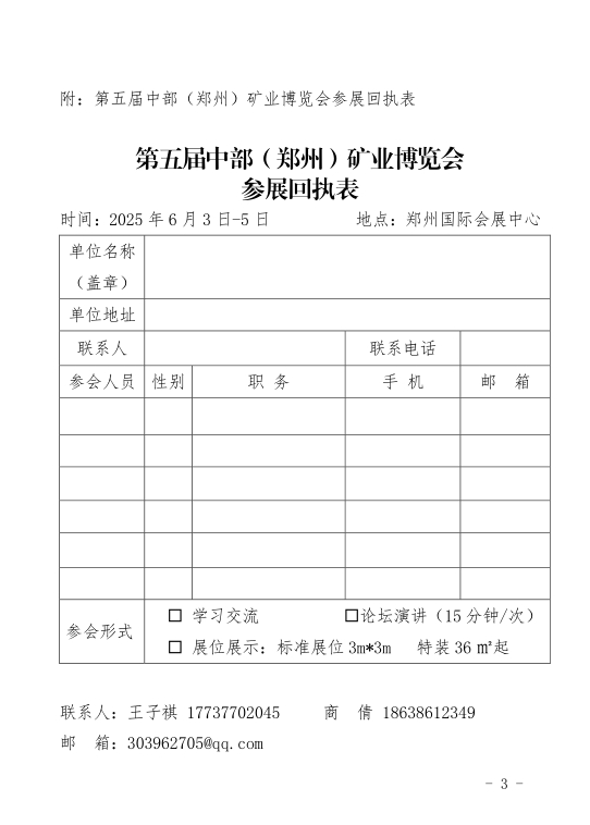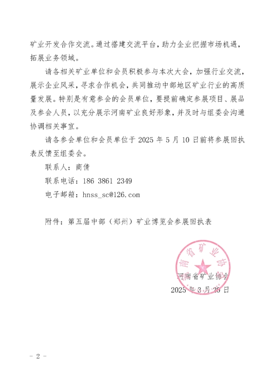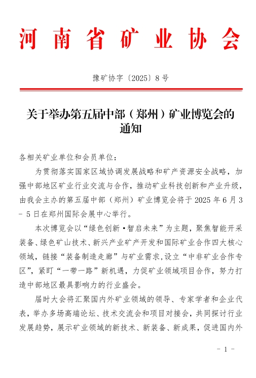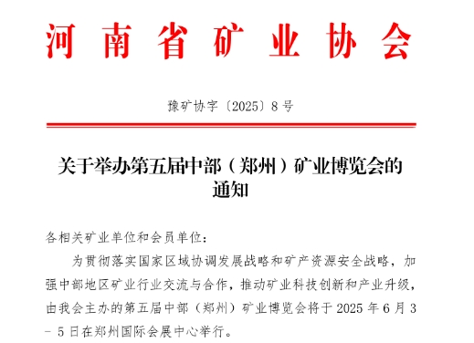 為深入貫徹落實(shí)國(guó)家關(guān)于礦業(yè)高質(zhì)量發(fā)展的戰(zhàn)略部署,加強(qiáng)中部地區(qū)礦業(yè)行業(yè)交流與合作,推動(dòng)礦業(yè)科技創(chuàng)新和產(chǎn)業(yè)升級(jí),由河南省礦業(yè)協(xié)會(huì)、河南省豫地科技集團(tuán)有限公司聯(lián)合主辦的2025第五屆中部(鄭州)礦業(yè)博覽會(huì)將于2025年6月3日-5日在鄭州國(guó)際會(huì)展中心隆重舉辦,現(xiàn)誠(chéng)邀礦業(yè)領(lǐng)域領(lǐng)導(dǎo)嘉賓蒞臨參觀,共享行業(yè)前沿成果,共謀產(chǎn)業(yè)創(chuàng)新之路!
