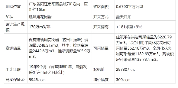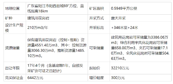 廣東省陽江市陽西縣城70°方向,直距約16km,生產(chǎn)規(guī)模170萬m³/年,保有建筑用花崗巖(控制+推斷)資源量3248.5萬m³,其中:控制資源量2442.6萬m³,推斷資源量805.9萬m³。 可采儲量:建筑用花崗巖可采儲量為3220.79萬m³;綜合利用半風化花崗巖可采儲量362.18萬m³,全風化花崗巖可采儲量1182.63萬m³,殘坡積層可采儲量135.73萬m³。出讓年限:19年9個月(含基建期1年,自頒發(fā)采礦許可證之日起計),起始價:29730萬元。 標的2:廣東省陽西縣程村鎮(zhèn)西一礦區(qū)建筑用花崗巖礦采礦權(quán) 廣東省陽江市陽西縣城69°方位,直線距離18km。生產(chǎn)規(guī)模210萬m³/年,保有建筑用花崗巖(控制+推斷)資源量4551.40萬m³,其中:控制資源量3066.30萬m³,推斷資源量1485.10萬m³。 可采儲量,建筑用花崗巖可采儲量為3386.06萬m³;綜合利用半風化花崗巖可采儲量658.00萬m³,夾石可采儲量17.10萬m³,全風化花崗巖可采儲量504.63萬m³。出讓年限17年4個月(含基建期1年,自頒發(fā)采礦許可證之日起計),起始價:32210萬元。