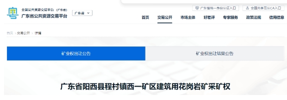 近日,廣東陽江市公共資源交易中心掛牌出讓2宗采礦權(quán),分別為廣東省陽西縣程村鎮(zhèn)大頂嶺礦區(qū)建筑用花崗巖礦采礦權(quán)和廣東省陽西縣程村鎮(zhèn)西一礦區(qū)建筑用花崗巖礦采礦權(quán)。兩宗礦權(quán)資源量近7800萬方,生產(chǎn)規(guī)模380萬m³/年,起始價:29730萬元。起始價共計近6.2億元。
