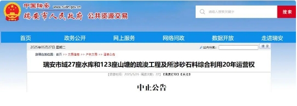 近日,浙江溫州中正拍賣(mài)有限公司發(fā)布公告,中止原定于5月30日進(jìn)行拍賣(mài)27座水庫(kù)和123座山塘的疏浚工程及所涉砂石料綜合利用20年運(yùn)營(yíng)權(quán)出讓活動(dòng)。