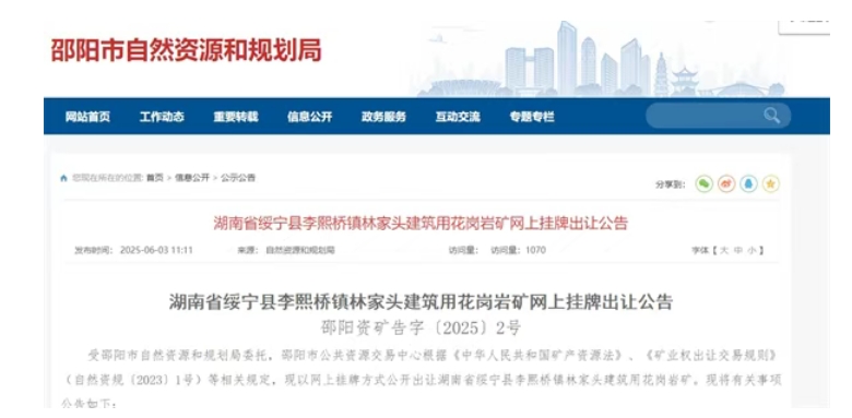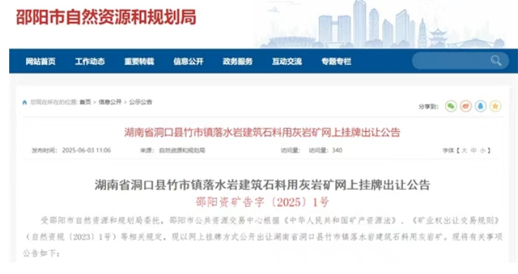 6月3日,湖南邵陽自然資源和規(guī)劃局發(fā)布3宗砂石礦掛牌出讓信息。據(jù)悉,3宗砂石礦合計資源儲量4570萬噸,年生產(chǎn)規(guī)模360萬噸,掛牌起始價約1.56億元。另外,3宗砂石礦均為“凈礦”出讓,競得人還須支付“凈礦”成本合計約9644.68萬元,掛牌時間2025年7月7日-7月21日。經(jīng)計算,3宗砂石礦競拍單價平均為5.52元/噸。 其中,湖南省洞口縣竹市鎮(zhèn)落水巖建筑石料用灰?guī)r礦年產(chǎn)能最高,180萬噸/年; 湖南省綏寧縣李熙橋鎮(zhèn)林家頭建筑用花崗巖礦競拍資源價款最高,5.86元/噸; 湖南省新邵縣龍溪鋪鎮(zhèn)牛山鋪建筑石料用灰?guī)r礦為整合出讓,除資源價款及“凈礦”成本外,還須支付原采礦權(quán)資產(chǎn)處置價款約2704.17萬元。 上述采礦權(quán)出讓收益首次征收比例為采礦權(quán)出讓成交價款的20%,采礦權(quán)人自愿一次性繳清的除外。 湖南省洞口縣竹市鎮(zhèn)落水巖建筑石料用灰?guī)r礦保有資源量2228.4萬噸(837.7萬立方米);采礦回采率98%,可采儲量為2183.8萬噸(821萬方),生產(chǎn)規(guī)模180萬噸/年,擬出讓年限13.1(含礦山基建期1年),掛牌出讓起始價7644萬元,“凈礦”出讓成本4786.09萬元。經(jīng)計算,該項目噸成本5.57元。 湖南省綏寧縣李熙橋鎮(zhèn)林家頭建筑用花崗巖礦控制資源量1253.9萬噸(537.9萬方);采礦回采率98%,可采資源量為1205.9萬噸,其中強風化花崗巖礦447.3萬噸、中風化花崗巖礦100.4萬噸、微風化花崗巖礦658.2萬噸。生產(chǎn)規(guī)模100萬噸/年,擬出讓年限13.1年(含礦山基建期1年),掛牌出讓起始價4197萬元,“凈礦”出讓3150.59萬元,經(jīng)計算,該項目噸成本5.86元。 湖南省新邵縣龍溪鋪鎮(zhèn)牛山鋪建筑石料用灰?guī)r礦保有資源量1088.4萬噸(401.6萬方);采礦回采率98%,可采資源量為1066.6萬噸(393.6萬方)。生產(chǎn)規(guī)模80萬噸/年,擬出讓年限14.3年(含礦山基建期1年),掛牌出讓起始價3735萬元,“凈礦”出讓成本1708萬元。經(jīng)計算,該項目噸成本5元。 另外,該項目為整合出讓,競得人還須支付原采礦權(quán)資產(chǎn)處置價款2704.1668萬元。該項目“凈礦”成本不包括露天采場、生產(chǎn)加工區(qū)等配套設施的土地租賃。