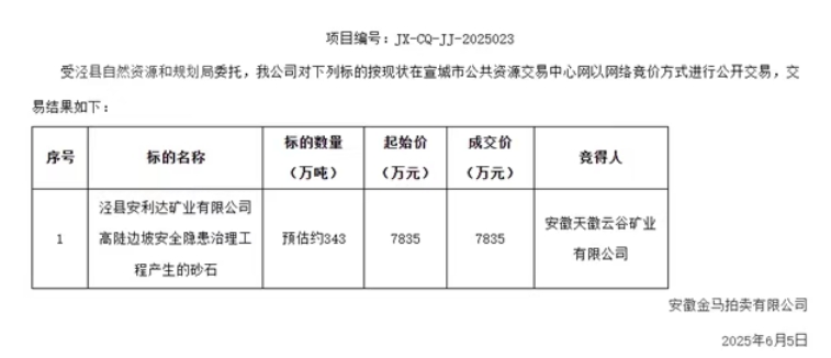6月5日,安徽省宣城市公共資源交易中心發(fā)布涇縣安利達(dá)礦業(yè)有限公司高陡邊坡安全隱患治理工程產(chǎn)生的砂石網(wǎng)絡(luò)競(jìng)價(jià)結(jié)果公告,競(jìng)得人為安徽天徽云谷礦業(yè)有限公司。據(jù)悉,標(biāo)的數(shù)量預(yù)估約343萬噸,成交價(jià)7835萬元,單價(jià)超22.84元/噸。 競(jìng)得人在與出讓方簽訂《轉(zhuǎn)讓合同》后90日內(nèi)繳納全部成交價(jià)款和合同履約保證金到出讓方指定賬戶,待出讓方收到全部?jī)r(jià)款后,競(jìng)得人方可進(jìn)場(chǎng)組織實(shí)施運(yùn)輸。出讓方根據(jù)整治施工工期、工程進(jìn)度分批次將交易標(biāo)的交付給競(jìng)得人。具體的交付時(shí)間與交付方式,請(qǐng)競(jìng)得人自行與工程施工方進(jìn)行協(xié)商。 競(jìng)得人按照出讓方要求的期限(項(xiàng)目治理工程完工后 180天內(nèi))完成運(yùn)輸,逾期或未按照出讓方要求完成運(yùn)輸?shù)模曂?jìng)得人自行放棄,由出讓方自行處理,競(jìng)得人承擔(dān)違約責(zé)任,合同履約保證金作為違約金不予退還。競(jìng)得人按照出讓方要求的期限完成出讓方交付的標(biāo)的外運(yùn)工作,經(jīng)出讓方驗(yàn)收合格無違約行為后,合同履約保證金無息退還至原賬戶。
