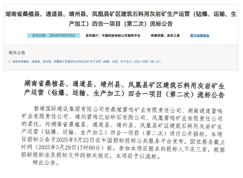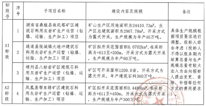 近日,湖南省桑植縣、通道縣、靖州縣、鳳凰縣礦區(qū)建筑石料用灰?guī)r礦生產(chǎn)運(yùn)營(鉆爆、運(yùn)輸、生產(chǎn)加工)四合一項(xiàng)目(第二次)因投標(biāo)人不足三家流標(biāo)。項(xiàng)目生產(chǎn)總規(guī)模為年產(chǎn)760萬噸,資金來源為自籌資金42718萬元。 據(jù)了解,該項(xiàng)目第一次招標(biāo)也因投標(biāo)人不足流標(biāo)。 湖南省桑植縣、通道縣、靖州縣、鳳凰縣礦區(qū)建筑石料用灰?guī)r礦生產(chǎn)運(yùn)營(鉆爆、運(yùn)輸、生產(chǎn)加工)四合一項(xiàng)目己由項(xiàng)目審批/核準(zhǔn)/備案機(jī)關(guān)批準(zhǔn),項(xiàng)目資金來源為自籌資金42718萬元,招標(biāo)人為桑植雷鳴礦業(yè)有限責(zé)任公司、湖南通道雷鳴礦業(yè)有限責(zé)任公司、靖州雷鳴億安砂石有限公司、鳳凰雷鳴礦業(yè)有限責(zé)任公司。生產(chǎn)總規(guī)模為年產(chǎn)760萬噸。 據(jù)此前招標(biāo)公告顯示,本項(xiàng)目包含四個(gè)子項(xiàng)目,分別是: 1、湖南省桑縣珠璣塔礦區(qū)建筑石料用灰?guī)r礦(鉆爆、運(yùn)輸、生產(chǎn)加工)項(xiàng)目,項(xiàng)目業(yè)主為桑植雷鳴礦業(yè)有限責(zé)任公司,年產(chǎn)40萬噸。 2、通道縣隴城鎮(zhèn)大地沖建筑石料用灰?guī)r礦(鉆爆、運(yùn)輸、生產(chǎn)加工)項(xiàng)目,項(xiàng)目業(yè)主為湖南通道雷鳴礦業(yè)有限責(zé)任公司,年產(chǎn)60萬噸。 3、靖州縣八姑巖礦區(qū)建筑石料用灰?guī)r礦(鉆爆、運(yùn)輸、生產(chǎn)加工)項(xiàng)目,項(xiàng)目業(yè)主為靖州雷鳴億安砂石有限公司,年產(chǎn)360萬噸。 4、鳳凰縣幫東繡礦區(qū)建筑石料用灰?guī)r礦(鉆爆、運(yùn)輸、生產(chǎn)加工)項(xiàng)目,項(xiàng)目業(yè)主為鳳凰雷鳴礦業(yè)有限責(zé)任公司,年產(chǎn)300萬噸。