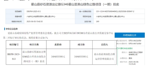 6月6日,安徽省六安市霍山縣砂石資源出讓暨G346霍山至英山綠色公路項(xiàng)目(一期)成功出讓。標(biāo)的一為3963.01萬噸砂石資源,標(biāo)的二為G346霍山至英山綠色公路項(xiàng)目(一期)建設(shè)。以上兩個(gè)標(biāo)的整體拍賣,總成交價(jià)近25億元,競得人為霍山縣霍英綠色公路運(yùn)營管理有限公司。 根據(jù)公告,本次拍賣的砂石資源位于G346霍山至英山綠色公路項(xiàng)目(一期)范圍內(nèi),砂量約1576萬噸,石料約2387.01萬噸。競得人以取得的砂石經(jīng)營收益對(duì)G346霍山至英山綠色公路項(xiàng)目(一期)投資建設(shè),無需支付砂石資源出讓價(jià)款。