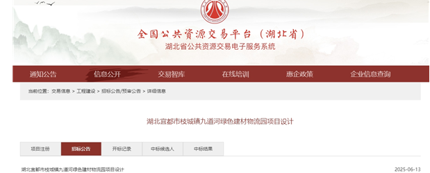 6月13日,湖北省宜昌公共資源交易電子服務(wù)系統(tǒng)發(fā)布宜都市枝城鎮(zhèn)九道河綠色建材物流園項目設(shè)計招標公告,投標截止時間為2025年7月4日。據(jù)計劃,該項目估算投資182.65萬元,招標人為宜都市國通投資開發(fā)有限責任公司。