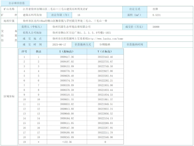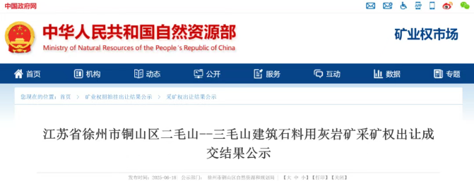 近日,徐州市自然資源網(wǎng)上交易系統(tǒng)公示了一則關(guān)鍵礦業(yè)權(quán)交易信息:江蘇省徐州市銅山區(qū)二毛山 -- 三毛山建筑石料用灰?guī)r礦以5.6億元成交,引發(fā)區(qū)域建材行業(yè)關(guān)注。