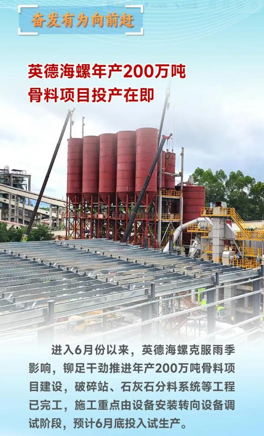 最新消息,進入6月份以來,英德海螺正在加速推進年產200萬噸骨料項目建設,破碎站、石灰石分料系統(tǒng)等工程已完工,施工重點由設備安裝轉向設備調試階段,預計6月底投入試生產。