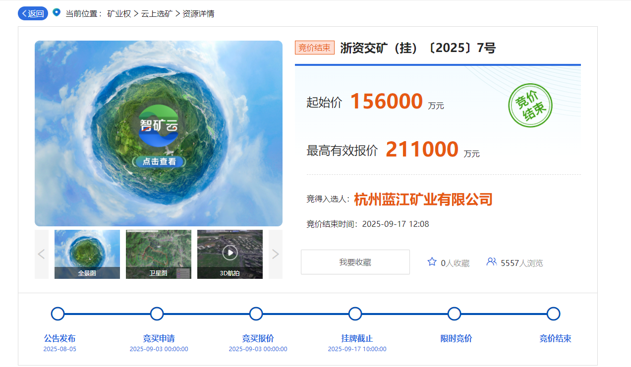 近日,浙江省自然資源網(wǎng)上交易中心公布浙江省建德市梅城鎮(zhèn)濱江村官路邊礦區(qū)建筑用安山巖礦拍賣結(jié)果信息,競(jìng)得入選人為杭州藍(lán)江礦業(yè)有限公司,最高有效報(bào)價(jià)21.1億元。