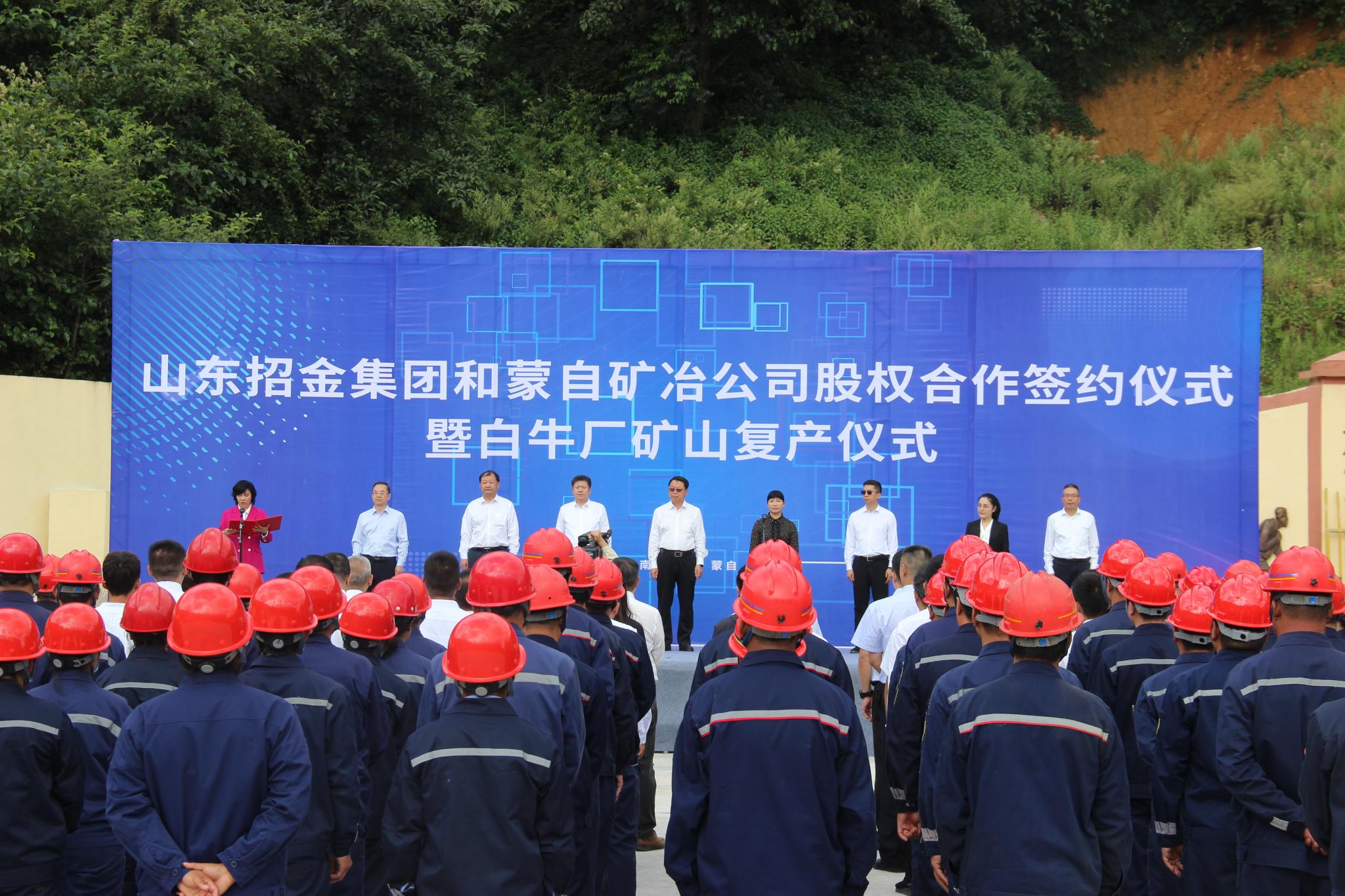 9月19日,蒙自市在白牛廠礦山舉行山東招金集團(tuán)與蒙自礦冶公司股權(quán)合作簽約儀式暨白牛廠礦山復(fù)產(chǎn)儀式。紅河州委書記趙瑞君出席儀式并宣布蒙自市白牛廠礦山正式復(fù)產(chǎn)。紅河州委副書記、州長羅萍致辭,紅河州委常委、市委書記李梅主持復(fù)產(chǎn)儀式,山東省招遠(yuǎn)市委常委、常務(wù)副市長劉超,蒙自市委副書記、市長張波參加。