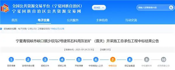 9月24日,內(nèi)蒙古康寧礦業(yè)股份有限公司成功中標(biāo)寧夏青銅峽市峽口鎮(zhèn)沙壩溝2號(hào)建筑石料用灰?guī)r礦(露天)開采施工總承包工程,中標(biāo)價(jià)7.21元/噸。該項(xiàng)目采礦工程量200萬-300萬噸/年,計(jì)劃工期11.5年,運(yùn)營(yíng)期要求2+3年(按照實(shí)際采礦工程量結(jié)算)。