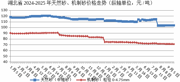 在砂石品類中,天然砂與機制砂價格走勢出現(xiàn)一定分化。監(jiān)測數(shù)據(jù)顯示,9月份,湖北省天然砂(中粗砂)全省均價為103.76元/噸,環(huán)比小幅上漲0.25%。盡管漲幅有限,但這一上漲態(tài)勢反映出當前天然砂市場供應相對緊俏,一方面受河道采砂管控政策持續(xù)影響,天然砂開采量得到有效控制,市場供應量增長較為緩慢;另一方面,隨著省內(nèi)部分基礎設施建設項目和房地產(chǎn)項目逐步推進,對天然砂的需求保持穩(wěn)定,供需關系的微妙變化推動了天然砂價格的小幅上揚。