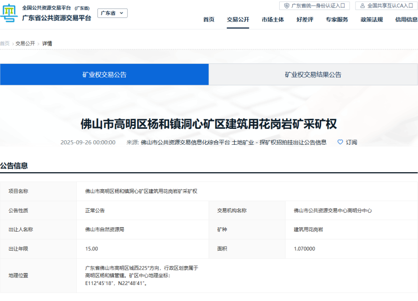 近日,佛山市公共資源交易中心以網(wǎng)上掛牌形式出讓佛山市高明區(qū)楊和鎮(zhèn)洞心礦區(qū)建筑用花崗巖礦采礦權(quán)。該礦權(quán)礦區(qū)位于廣東省佛山市高明區(qū)城西225°方向,建筑用花崗巖保有資源量礦石總量為4080.2萬立方米,出讓年限為15年,年生產(chǎn)規(guī)模為300萬立方米,起始價(jià)為27580.57萬元。