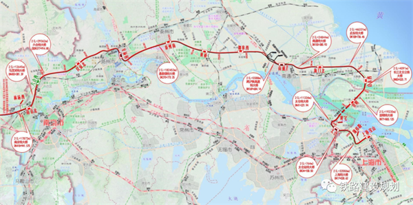 項(xiàng)目起自上海市新建上海寶山站,經(jīng)江蘇省蘇州市、南通市、泰州市、揚(yáng)州市、南京市及安徽省滁州市、合肥市,接入既有合肥南站。線路全長553.762公里,其中新建鐵路519.046公里,設(shè)計(jì)時(shí)速350公里。全線設(shè)16座車站,其中新建車站10座。