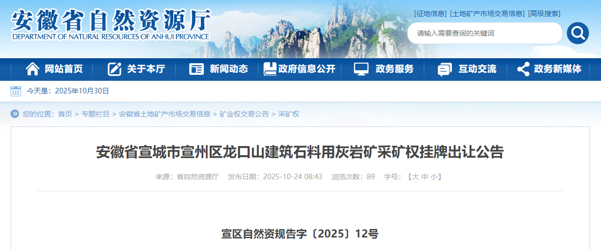安徽省宣城市宣州區(qū)龍口山建筑石料用灰?guī)r礦采礦權(quán)掛牌出讓公告