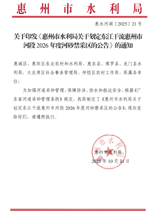 此次公告的發(fā)布,是惠州市水利局落實(shí)《廣東省河道采砂管理?xiàng)l例》、規(guī)范東江干流河道采砂行為的重要舉措,為2026年度東江干流惠州市河段河砂管理工作提供了明確依據(jù)。