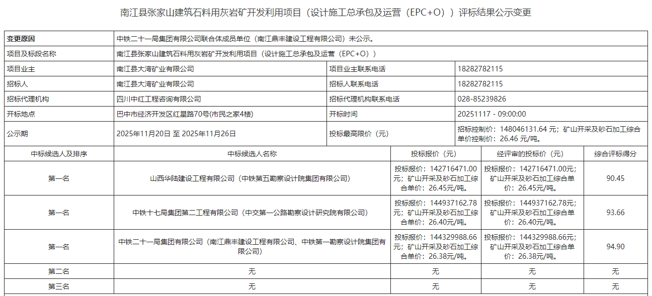 近日,四川省公共資源交易信息網(wǎng)發(fā)布南江縣張家山建筑石料用灰?guī)r礦開(kāi)發(fā)利用項(xiàng)目(設(shè)計(jì)施工總承包及運(yùn)營(yíng)(EPC+O))評(píng)標(biāo)結(jié)果公示及評(píng)標(biāo)結(jié)果變更公示。
