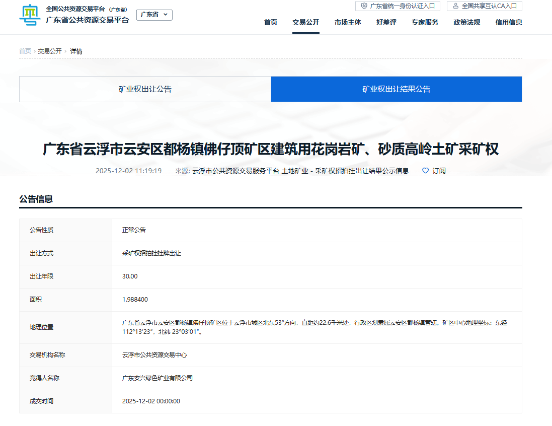 該礦位于廣東省云浮市云安區(qū)都楊鎮(zhèn)佛仔頂?shù)V區(qū)位于云浮市城區(qū)北東53°方向,可采儲量為建筑用花崗巖23312.01萬立方米、砂質高嶺土2218.03萬立方米、建設用砂全風化花崗巖 684.90萬立方米、半風化花崗巖1134.11萬立方米、殘坡積層441.39萬立方米,出讓年限為30年,生產規(guī)模為950萬立方米/年,廣東安興綠色礦業(yè)有限公司最終以底價150000萬元競得此礦。
