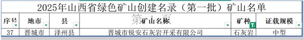 日前,2025年山西省綠色礦山創(chuàng)建名錄(第一批)礦山名單公布,晉城市銳安石灰?guī)r開采有限公司憑借在綠色生產(chǎn)、生態(tài)保護(hù)等方面的突出表現(xiàn)順利入選,成為此次名錄中唯一入選的石灰?guī)r礦企業(yè)。