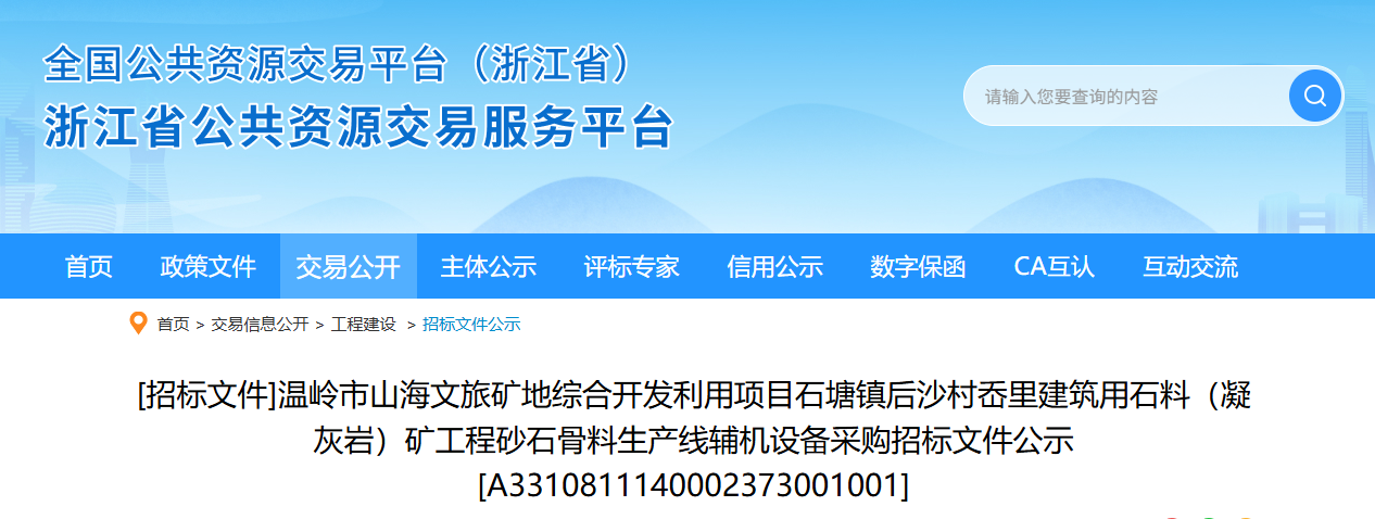 近日,浙江溫嶺市山海文旅礦地綜合開發(fā)利用項目石塘鎮(zhèn)后沙村岙里建筑用石料(凝灰?guī)r)礦工程己由溫嶺市發(fā)展和改革局批準建設(shè),項目己具備招標條件,現(xiàn)對該項目的砂石骨料生產(chǎn)線輔機設(shè)備采購進行公開招標。項目招標人為溫嶺市金達建設(shè)有限公司、浙江省隧道工程集團有限公司。