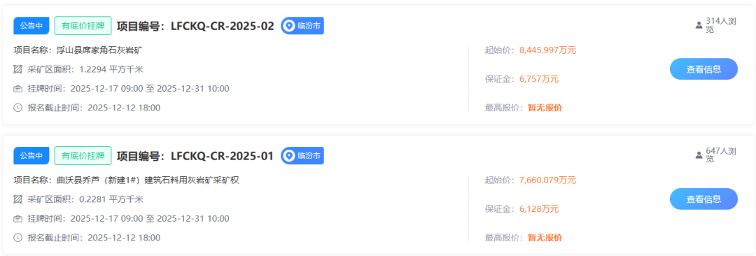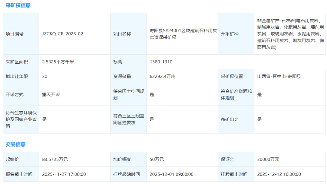 一宗位于山西省臨汾市曲沃縣,出讓資源儲(chǔ)量3058.76萬(wàn)噸(建筑石料用灰?guī)r礦2926.97萬(wàn)噸,水泥用灰?guī)r礦131.79萬(wàn)噸),起拍價(jià)7,660.079萬(wàn)元,但保證金僅6,128萬(wàn)元;