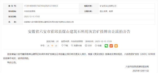12月5日,安徽省六安市自然資源和規(guī)劃局發(fā)布霍邱縣煤山建筑石料用灰?guī)r礦掛牌出讓流拍公告。公告指出,因截止報價前無競買人報價,該礦最終流拍。
