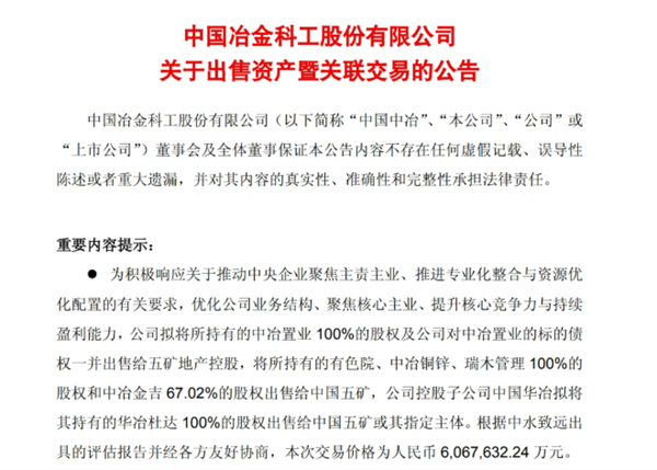 公告指出,此次交易構(gòu)成關(guān)聯(lián)交易,不構(gòu)成重大資產(chǎn)重組,已達(dá)到股東會(huì)審議標(biāo)準(zhǔn),需提交股東會(huì)審議批準(zhǔn)。通過本次交易,中國中冶將剝離非核心資產(chǎn)并優(yōu)化配置資源,有利于優(yōu)化公司業(yè)務(wù)結(jié)構(gòu)、聚焦核心主業(yè)、提升核心競爭力與持續(xù)盈利能力。