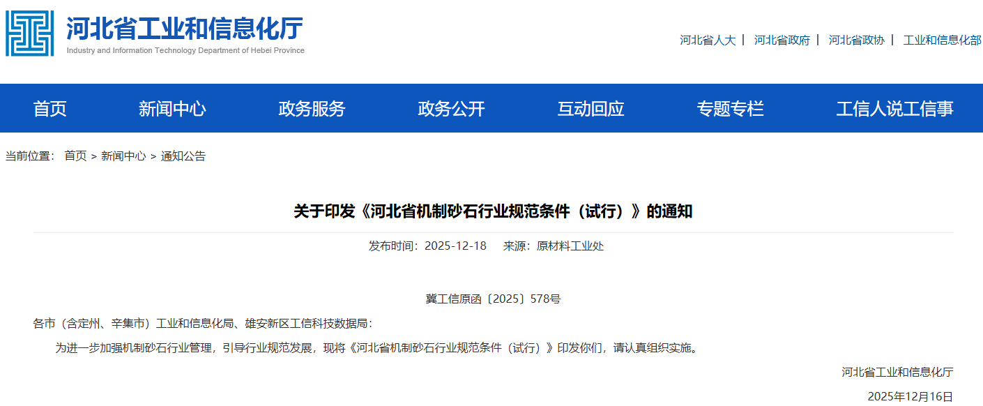 近日,河北省工業(yè)和信息化廳發(fā)布了《機制砂石行業(yè)規(guī)范條件(試行)》,文件中對于機制砂石的生產(chǎn)規(guī)模、能耗、產(chǎn)品質(zhì)量等方面做出了詳細的規(guī)定。