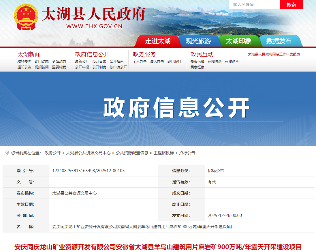 近日,安徽省太湖縣人民政府網(wǎng)站發(fā)布安慶同慶龍山礦業(yè)資源開發(fā)有限公司太湖縣羊烏山建筑用片麻巖礦900萬噸/年露天開采建設項目招標公告。