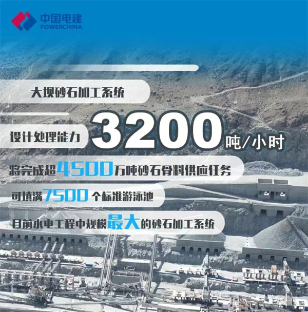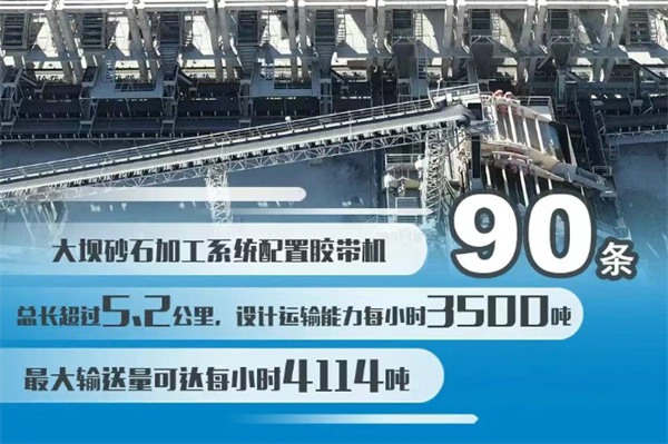 在砂石加工系統(tǒng)方面,該項目規(guī)模位居當(dāng)前水電工程之首,大壩砂石加工系統(tǒng)設(shè)計處理能力超3200噸/小時,將完成4500萬噸砂石骨料供應(yīng)任務(wù),(體量可填滿7500個標(biāo)準(zhǔn)游泳池);占地11.5萬平方米,土地利用率較傳統(tǒng)分散式系統(tǒng)提升30%以上,盡顯集約化優(yōu)勢;配置90條總長超5.2公里的膠帶機(jī),設(shè)計運(yùn)輸能力3500噸/小時,最大輸送量可達(dá)4114噸/小時,保障物料高效轉(zhuǎn)運(yùn)。