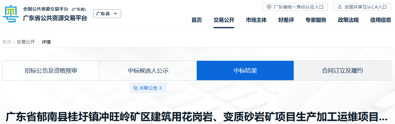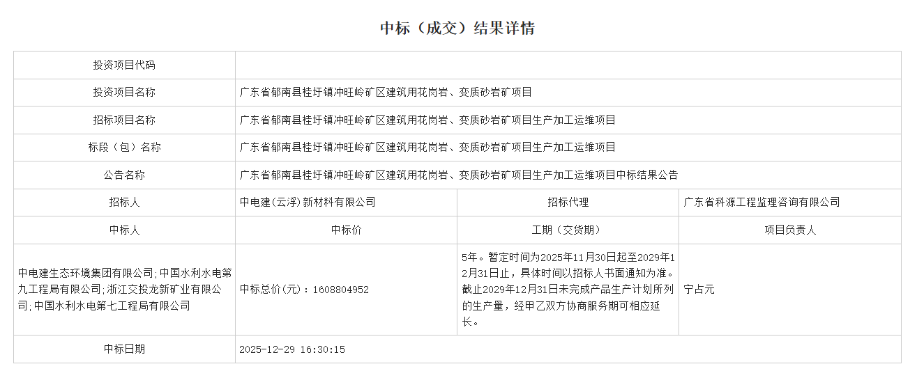 近日,廣東省公共資源交易平臺發(fā)布郁南縣桂圩鎮(zhèn)沖旺嶺礦區(qū)建筑用花崗巖、變質(zhì)砂巖礦項(xiàng)目生產(chǎn)加工運(yùn)維項(xiàng)目中標(biāo)結(jié)果公示。中電建生態(tài)環(huán)境集團(tuán)有限公司;中國水利水電第九工程局有限公司;浙江交投龍新礦業(yè)有限公司;中國水利水電第七工程局有限公司以160880.4952萬元的報價,成功中標(biāo)該項(xiàng)目!