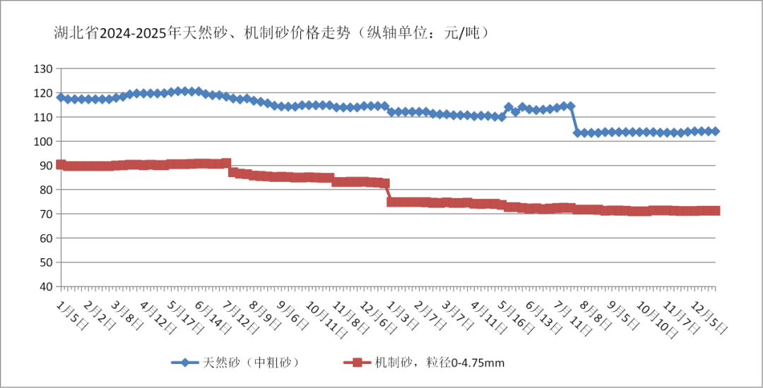 12月,天然砂與機(jī)制砂價格出現(xiàn)環(huán)比小幅上漲。其中,天然砂(中粗砂)全省均價為104.10元/噸,環(huán)比上漲0.49%;機(jī)制砂均價為71.28元/噸,環(huán)比微漲0.01%。盡管環(huán)比有所回暖,但與2024年同期相比,兩者價格仍分別處于9.11%和14.09%的下降區(qū)間,反映出2024年以來砂類產(chǎn)品整體價格水平仍顯著低于上年同期。
