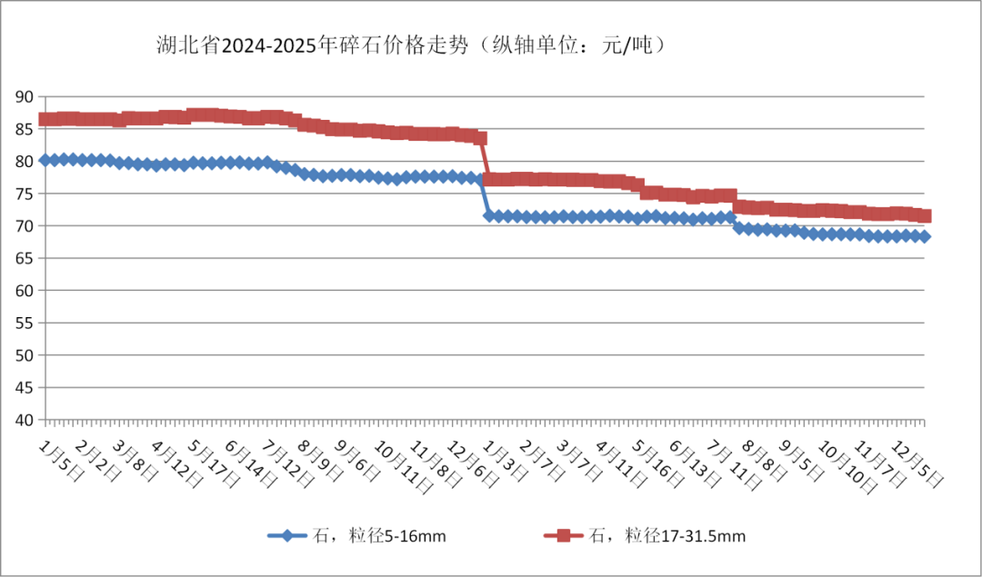 與砂類走勢不同,碎石價格12月環(huán)比輕微下跌。監(jiān)測的兩種規(guī)格碎石(粒徑5-16mm、17-31.5mm)全省均價分別為68.39元/噸和71.74元/噸,環(huán)比降幅分別為0.07%和0.22%。同比來看,跌幅更為明顯,均超過11%,顯示碎石市場同比仍處低位運(yùn)行。