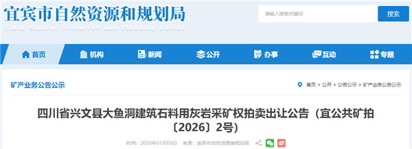 1月9日,四川省宜賓市自然資源和規(guī)劃局發(fā)布2宗砂石礦掛牌出讓公告。這2宗采礦權(quán)均為建筑石料用灰?guī)r礦,資源儲量共7856.3萬噸,合計(jì)產(chǎn)能400萬噸/年(2宗采礦權(quán)產(chǎn)能皆為200萬噸/年),起始金額共約1.42億元,平均資源價款1.75元/噸?,F(xiàn)場競拍時間均為2026年2月10日。