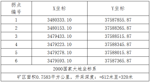 礦區(qū)范圍:礦區(qū)面積0.7583平方公里,開(kāi)采深度為 + 612 米至 + 320 米,由指定拐點(diǎn)圈定