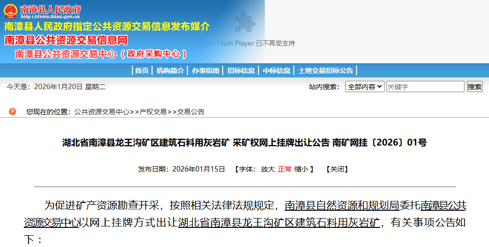 近日,湖北省南漳縣自然資源和規(guī)劃局委托南漳縣公共資源交易中心以網(wǎng)上掛牌方式出讓湖北省南漳縣龍王溝礦區(qū)建筑石料用灰?guī)r礦(出讓編號(hào):南礦網(wǎng)掛〔2026〕01 號(hào))。該礦區(qū)資源量達(dá)24093.8萬(wàn)噸,出讓年限30年,掛牌起始價(jià)為22650萬(wàn)元,相關(guān)交易將在湖北省公共資源產(chǎn)權(quán)交易平臺(tái)開(kāi)展。