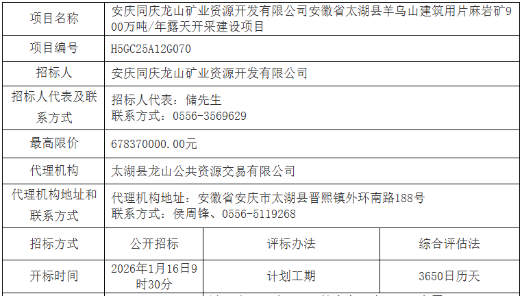 近日,安慶市公共資源交易中心發(fā)布安慶同慶龍山礦業(yè)資源開發(fā)有限公司安徽省太湖縣羊烏山建筑用片麻巖礦900萬噸年露天開采建設項目中標結(jié)果公示。根據(jù)出讓公告,滁州瑯琊山礦業(yè)工程技術(shù)有限公司、漢宸國際工程設計集團有限公司(聯(lián)合體)以59610.32萬元成功中標該項目。